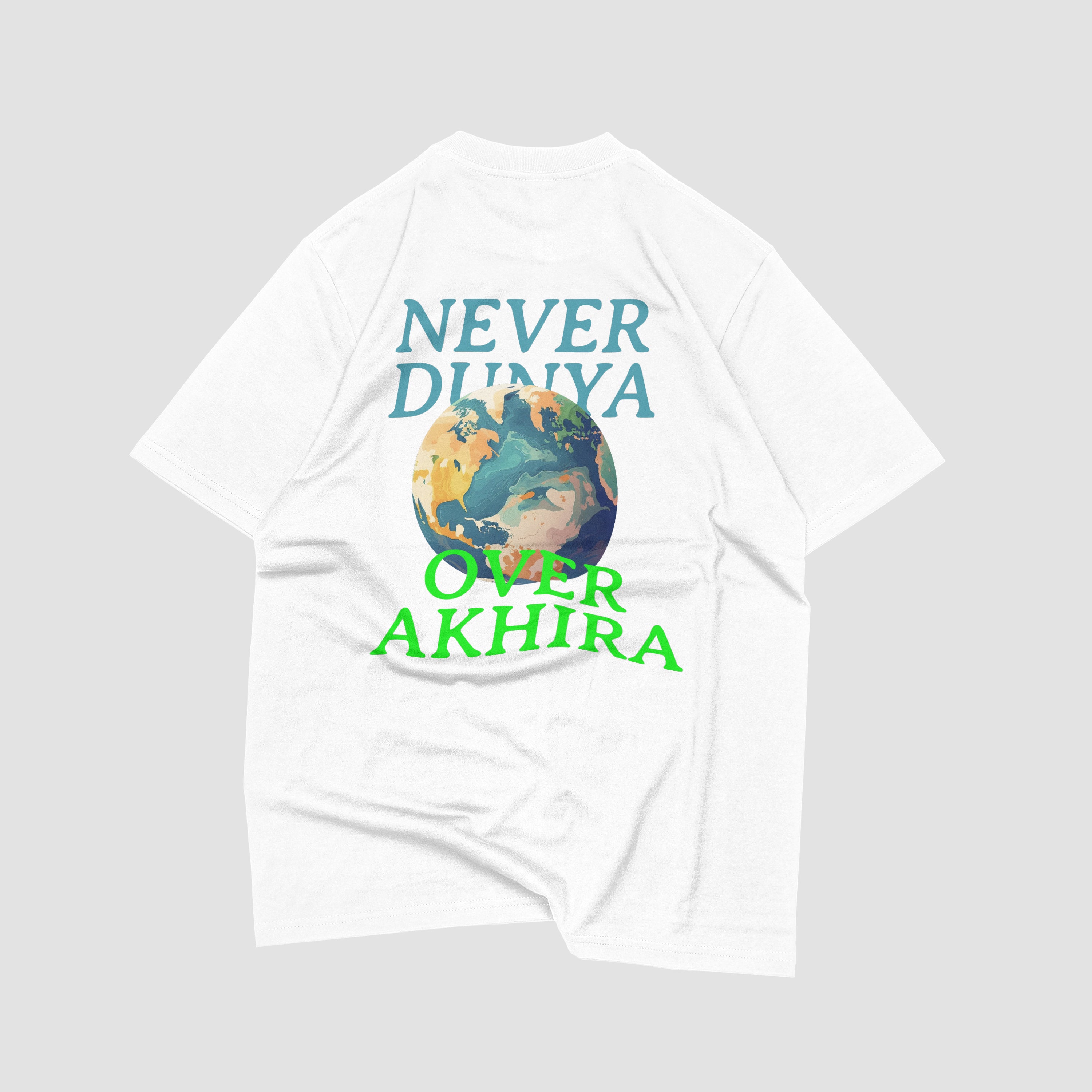 The bold design carries the message “Never Dunya over Akhira” a call to prioritize the hereafter over worldly distractions. Subtle yet powerful, it’s made for those who want their clothing to reflect both their values and their voice.